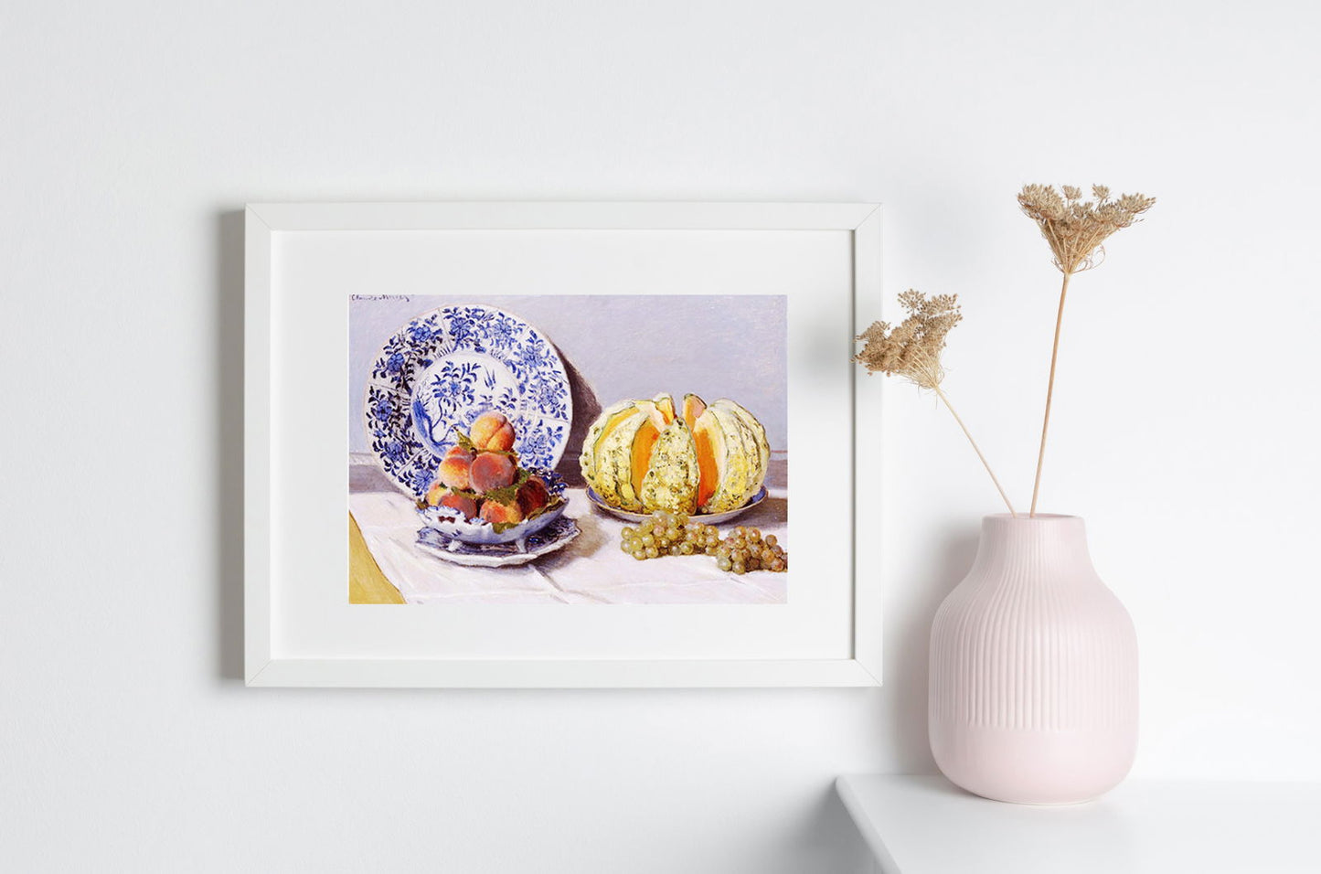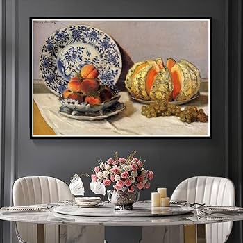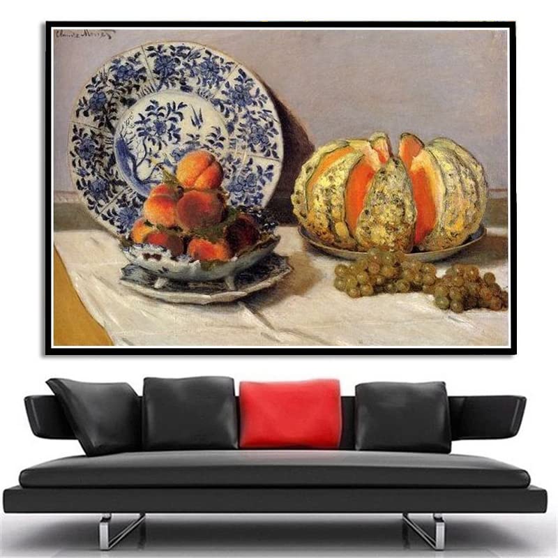 Den stadig livssmertermaling af Claude Monet er et mesterværk af impressionisme, der skiller sig ud for dens skønhed og enkelhed. Kassen, original 53 x 73 cm, viser en død natur med en melon, en plade med druer og et glasglas, alt sammen på et træbord.