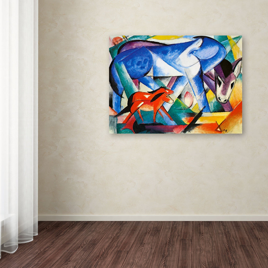 Die Komposition des Werkes ist ein Wunderwerk dynamischen Gleichgewichts. Beeinflusst von Kubismus und Futurismus fragmentiert Marc den Raum in winklige Ebenen, die rhythmisch miteinander verflochten sind. Der Blick wird sofort auf die imposante Figur eines blauen Pferdes gelenkt, das die Szene dominiert, dessen Körper sich mit monumentaler Anmut wölbt und einen fast mütterlichen Schutz über die kleinen roten Pferde im Vordergrund suggeriert. Diese Interaktion von Maßstäben und Formen schafft eine Tiefe, die nicht von der traditionellen Perspektive abhängt, sondern von der Überlagerung chromatischer Energien. Die Tiere scheinen aus der Erde selbst emporzusteigen, integriert in eine Landschaft aus Prismen und Lichtstrahlen, die andeuten, dass es keine Unterscheidung zwischen dem Lebewesen und seiner Umgebung gibt.