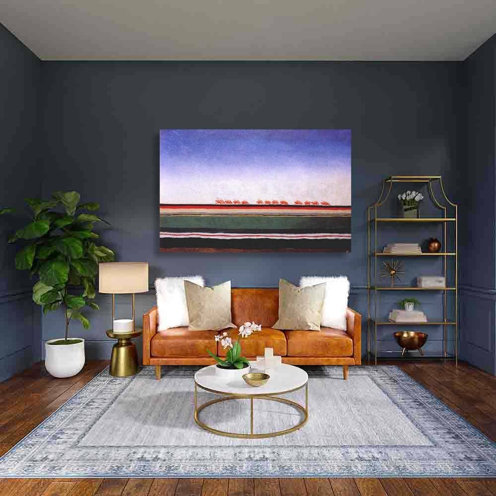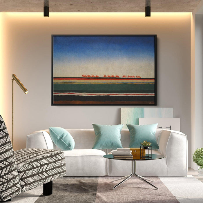 The work "Red Cavalry" by Kazimir Malevich, created in 1932, stands out as a formidable testimony of talent and unique vision of the pioneer of suprematism. Observing the painting, we are faced with a composition that, although less abstract than its famous supreme works such as "black square", still preserves a sense of simplification and geometrization that is emblematic of Malevich's style.