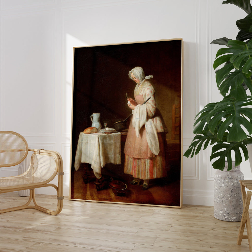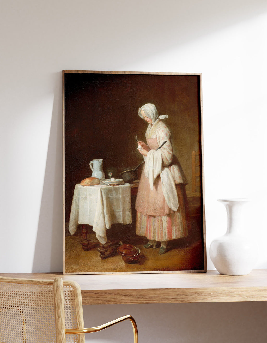 La pintura The Attentive Nurse de Jean-Baptiste-Siméon Chardin es una verdadera joya del arte francés del siglo XVIII. Esta obra maestra, de tamaño original de 46 x 37 cm, muestra a una enfermera atenta que sostiene a un niño en sus brazos mientras le da de comer con una cuchara.